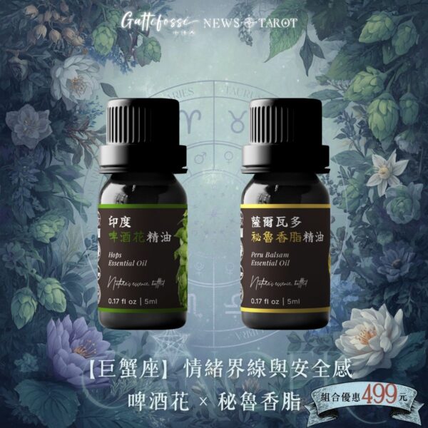 甜橙 x 佛手柑 x 大馬士革玫瑰 x 快樂鼠尾草 x 玫瑰天竺葵 精油組【巨蟹座】情緒界線與安全感|啤酒花 × 秘魯香脂精油組